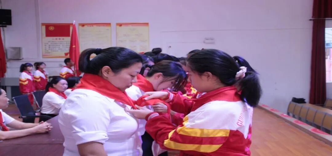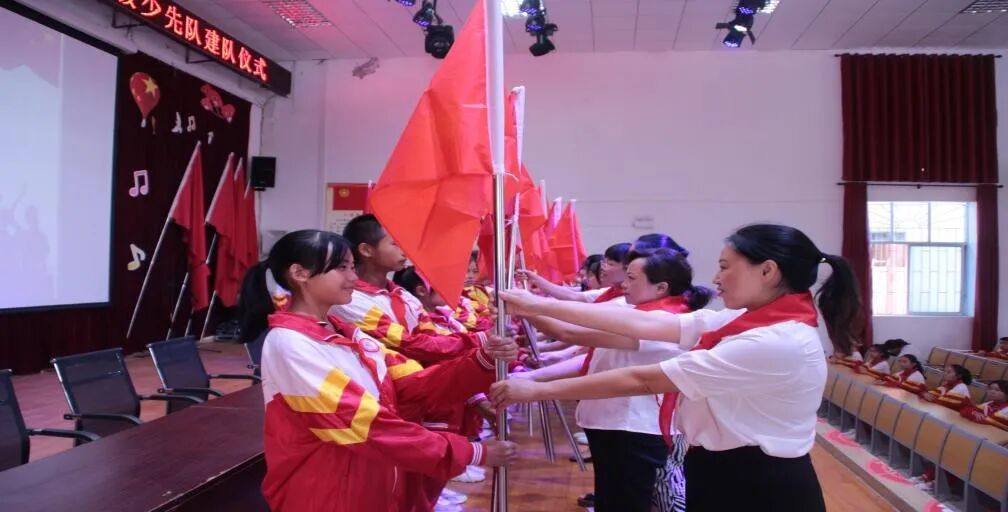 接着莅临我校指导团建工作的黔南州团州委书记黄祖方和贵定县团县委书记刘江及我校领导为辅导员们颁发了聘书,为各中队长授予了中队旗。少先队队员代表为各辅导员佩戴了红领巾,鲜艳的队旗和红领巾映衬着一张张充满朝气的脸,展示出少先队员的风采。
