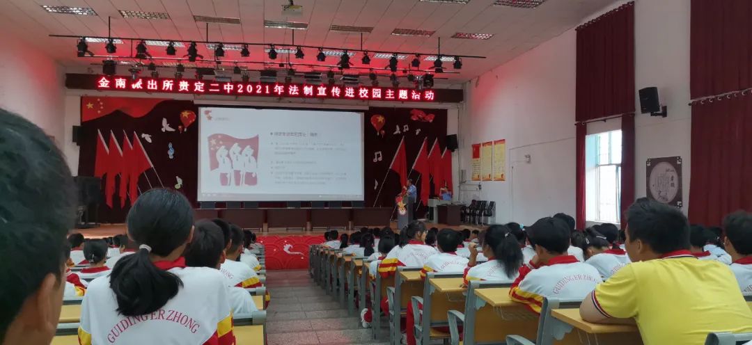 为增强广大师生的法制观念,进一步提高学生的自我保护能力。我校于2021年9月28日下午,邀请金南街道派出所法制宣传员黄小文警官到校为学校校师生开展法制宣讲活动。本次大会在学校多功能厅举行,出席本次活动的领导有杨珂校长、政教处舒定中主任以及九年级部分班级和班主任共600余名师生参加。